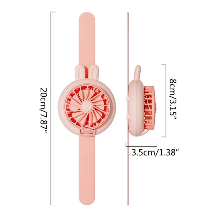 Bunny Ear LED Light-Up Rechargeable Portable Electric Fan Slap Wristband Watch -LED Light illuminated fans with strong airflow, quiet operation, and 90 degrees rotation -1 x USB 2.0 Dongle (Battery Capacity: 300 mAh) -Silicone Slap Snap Wristband Straps -Assorted Color (12 - 3 Units Per Color) -Fan Dimensions: 3.15" * 3" * 1.4" (Wristlet Length: 7.87") -Box Dimensions: 3.25" * 3.15" * 2" (Individually boxed and packaged) -Great for Outdoor Events, Festivals, Home, Office, Bedroom -100% Plastic -CA Prop 65 Advisory
