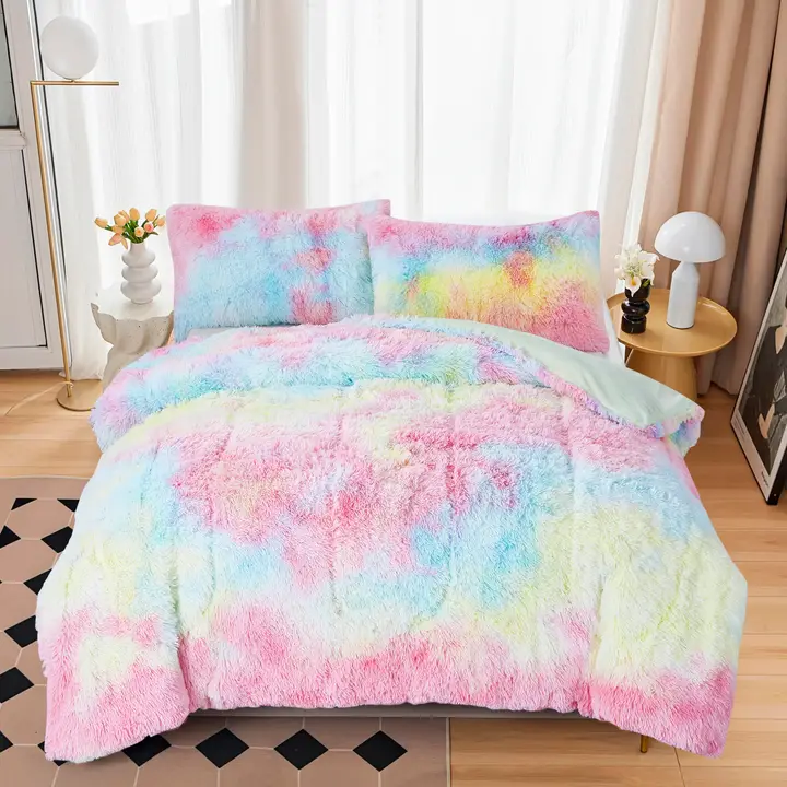 Faux Fur Luxury Filled Plush Youth Blanket with Shams. The blanket is measured at 86'x66', and the two shams are 20'x30'. The front face gives you warmth and elegance, while the micro suede backing, and faux down filling provide extra softness and comfort. Made with 100% EF-Velboa Micro Polyester for extra soft and simple care. Each set is packaged in a clear poly zipper suitcase-style bag