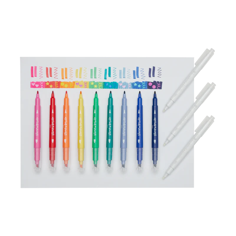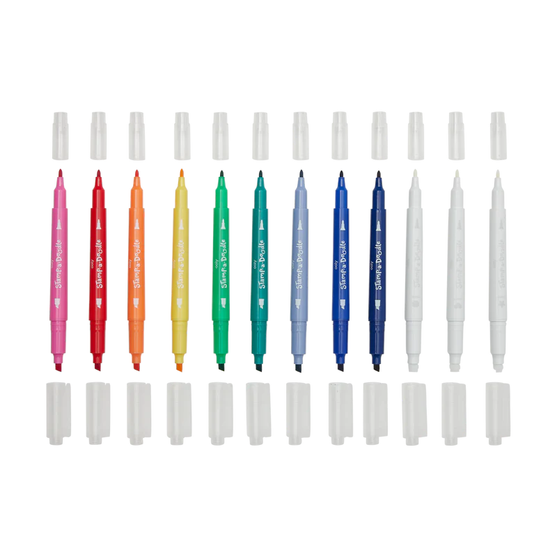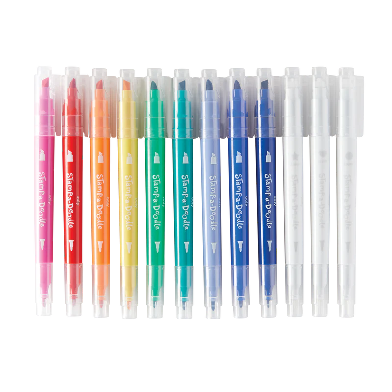 This Stamp-A-Doodle double-ended marker set is jam-packed with everything you need to make your mark! Each marker features a chisel tip on one end and a point tip on the other. There are nine double-ended markers in total with three bonus color changing markers featuring a fun stamp on one end.