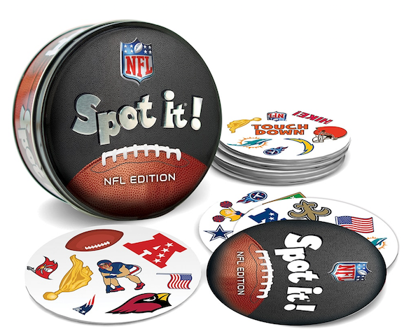Spot It! NFL Edition puts a football spin on the family favorite. Just like the other Spot It! games, NFL Edition comes with a variety of unique symbols for you to identify and match from card to card. Many of the symbols represent your favorite NFL teams and the game of football. Play it once or play all night, with 55 unique cards and five different mini-games, you?ll catch yourself going into overtime with Spot It! NFL Edition.